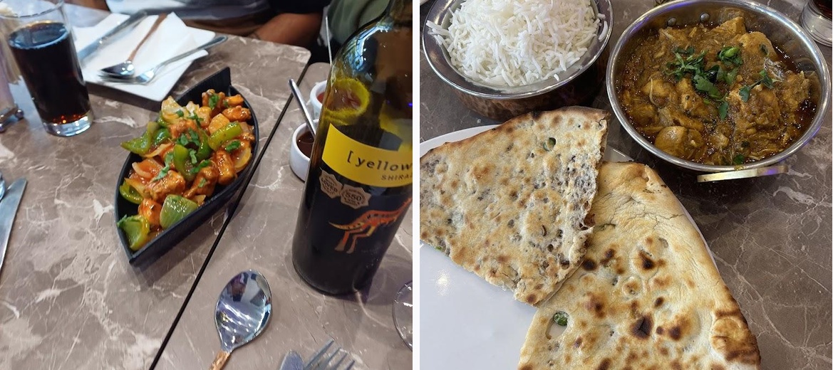 Really fresh and tasty food. Onion Bhaji and Fish Pakora were amazing, so crispy and fresh. Lamb and chicken curries were very tender and fabulous tasting. Biriyani came with a pastry top and so well spiced. Service was very good. Highly recommend!